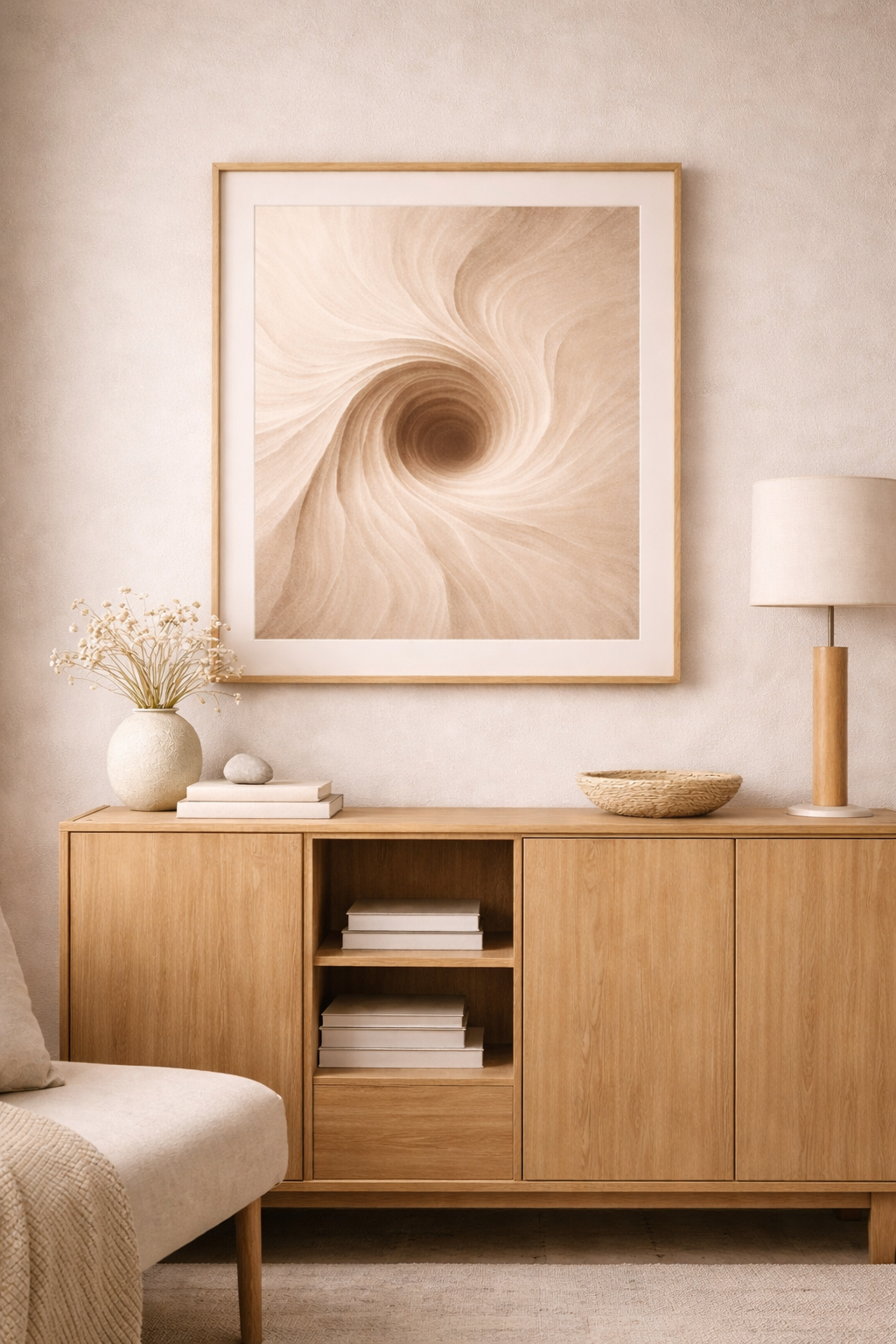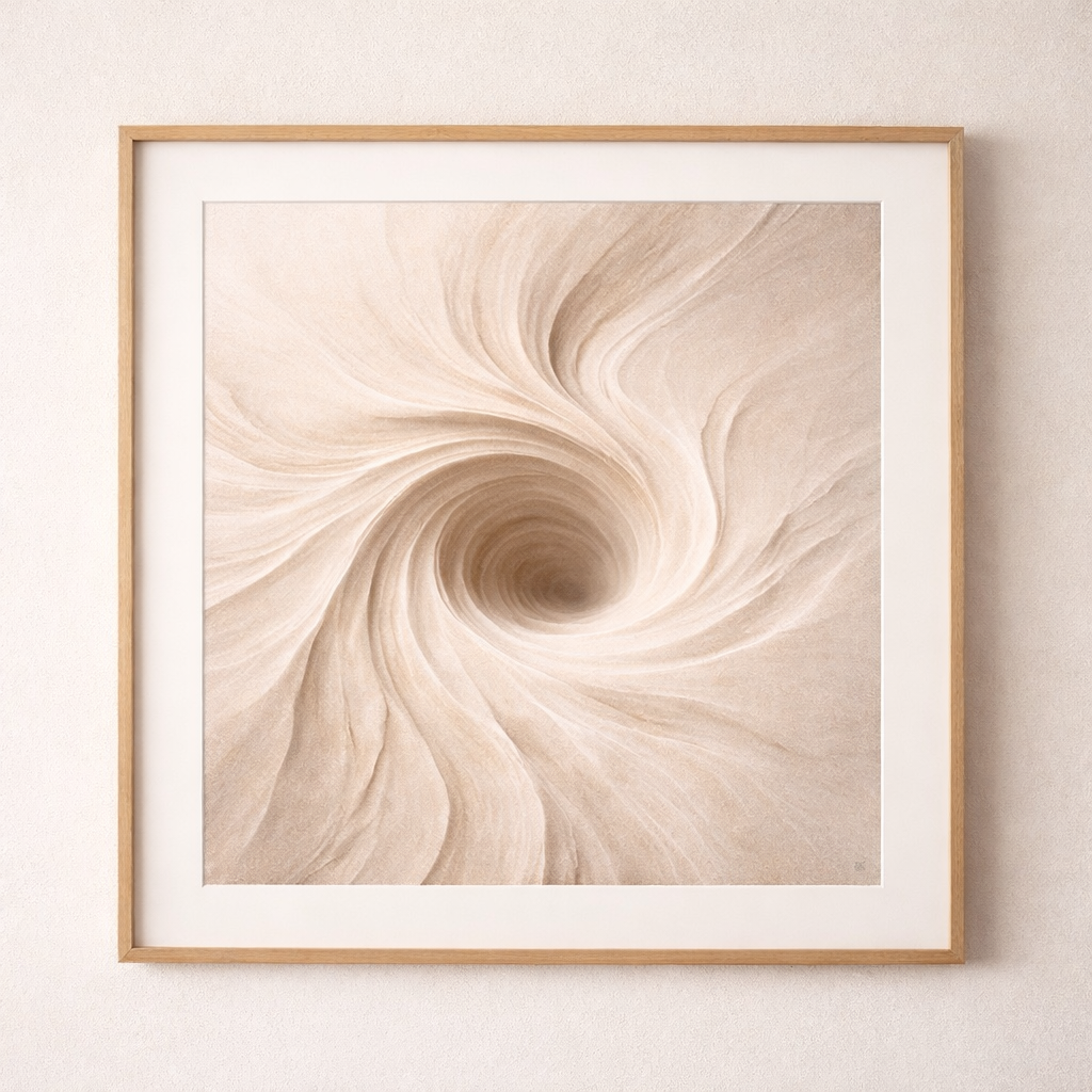 Soft layers converge into a central form, creating a sense of quiet movement and pull. The result is a calm, immersive presence shaped by erosion and time.