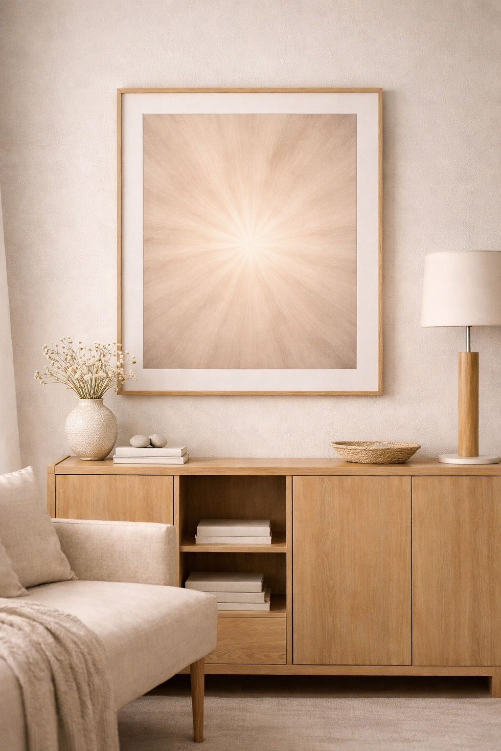 Fine textures open outward from a central point, creating a soft sense of movement and light. The result is a calm, luminous presence that brings clarity and ease to a space.